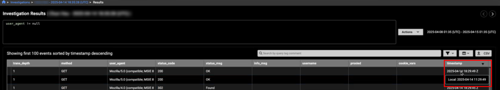 Note that in the Events Table, you need to click the timestamp to view the local time.