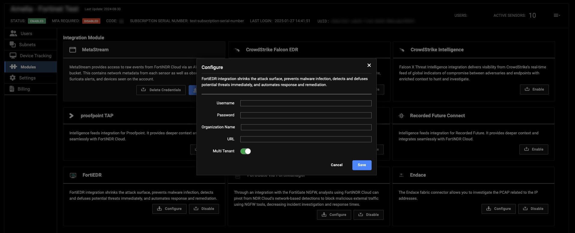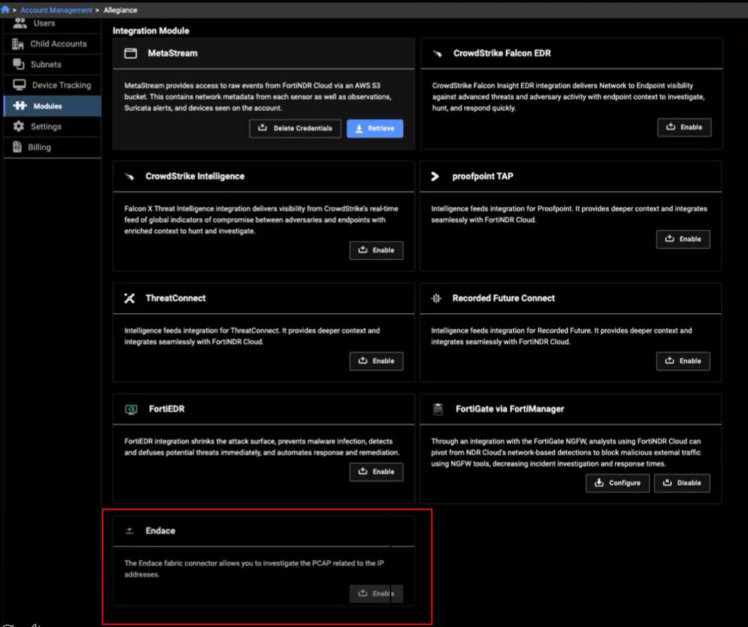 FortiNDR Cloud now supports integration with Endace. Endace probes packet capture data from on-premise, public, and private cloud environments. To enable the integration, go to Account Management > Modules and click Enable in the Endace module.