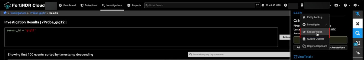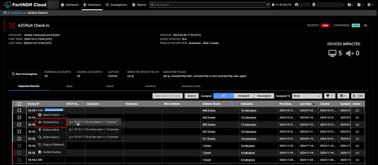 You can pivot to Endace by right-clicking an IP address in the Detections table or the Events table. After you pivot from FortiNDR Cloud, Endace will automatically create a new investigation.