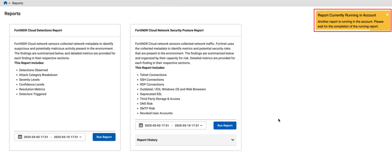 FortiNDR Cloud can support up to 35 pending queries simultaneously. To prevent system overload, we have added a tooltip advising users to wait before running another report.