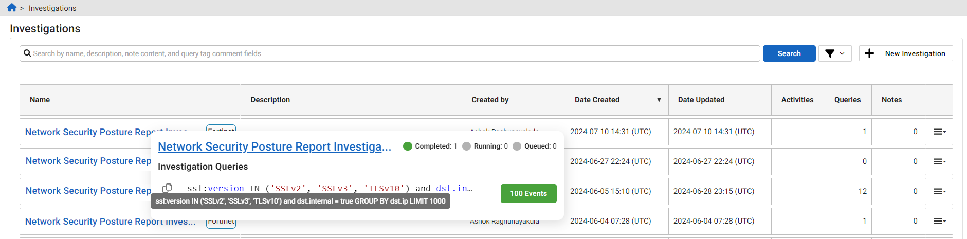 Hover over the investigation name to view a summary of the query status. The investigation tooltip shows the number of queries that are Completed, Running and Queued as well as the tags associated with the query. To view the query parameters at a glance, hover over the query string in the tooltip. To copy the query string, click the Copy Query icon at the left-side of the string.