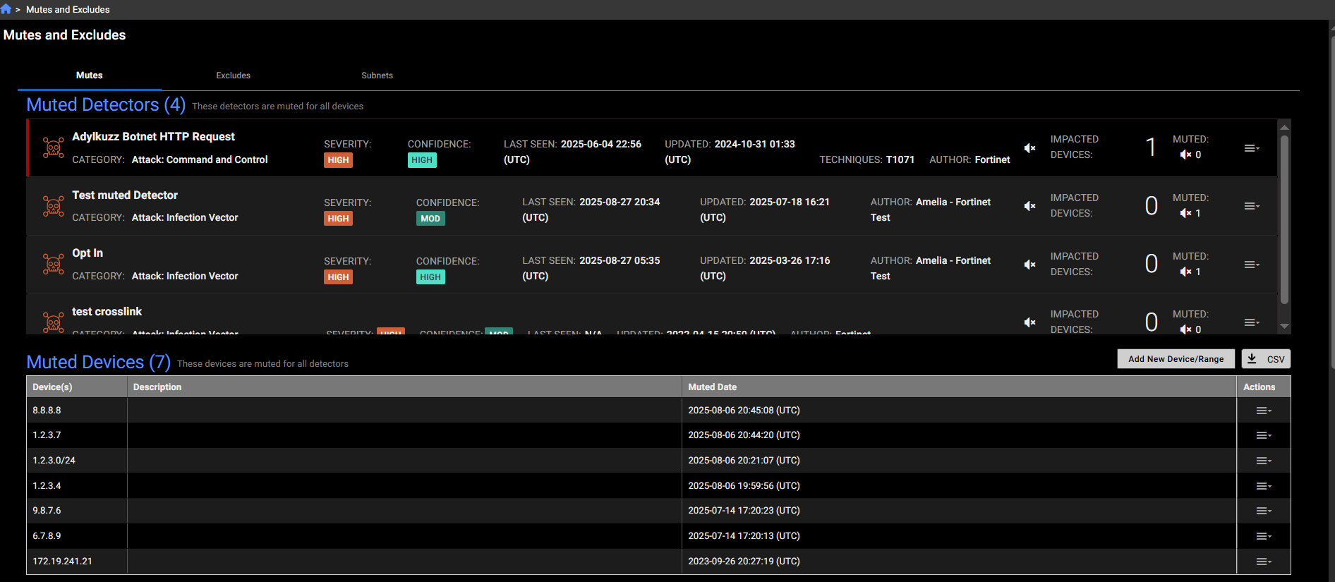 A new Mutes and Excludes page has been added to the main settings menu. This page summarizes all muted and excluded devices, including device-level mutes for detectors. It contains three tabs: Mutes, Excludes and Subnets.