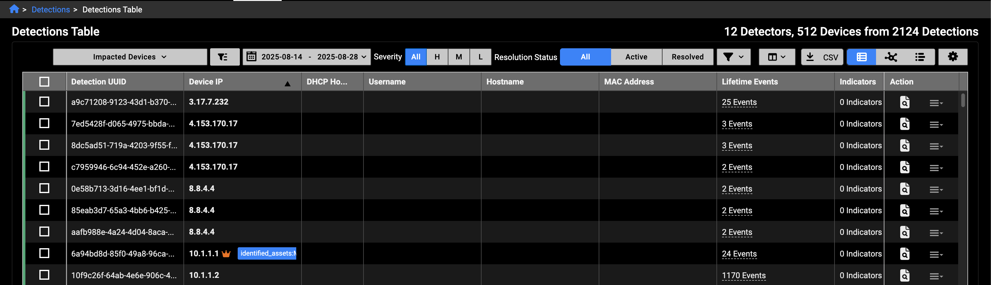 We have replaced the Device IP search box with a new filter called Impacted Devices in the Detections Table, Detections Visualizer and Detection Device Timeline. The IPs in the list are sorted by Risk Score. You can filter IPs with the search box and select the devices you want to include in the view.