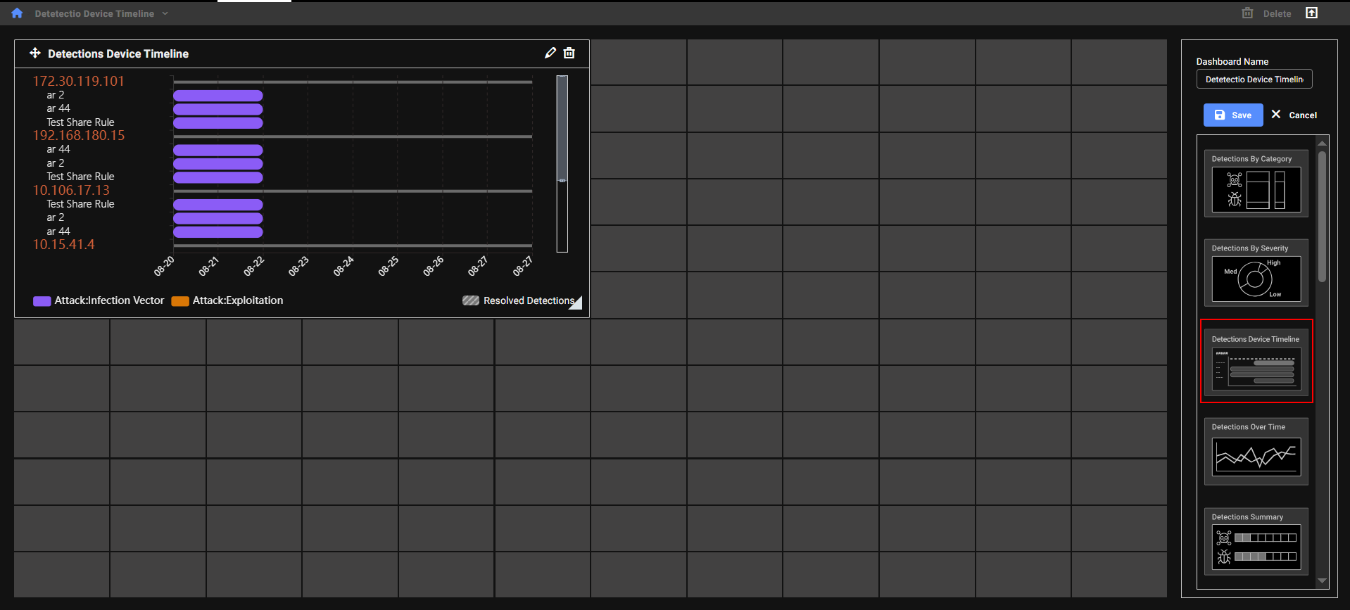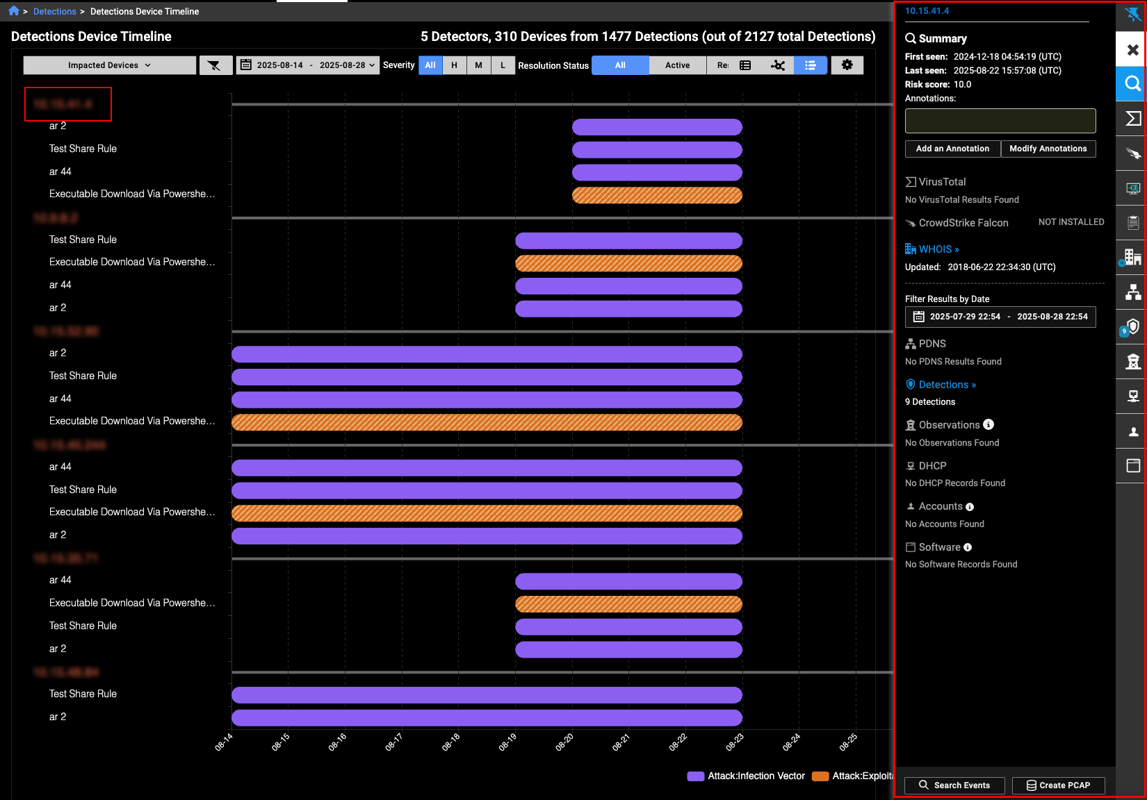 The Detections Device Timeline is available as a dedicated dashboard widget. By default, it displays the top five IPs with the highest risk scores from the past seven days. These settings are customizable.