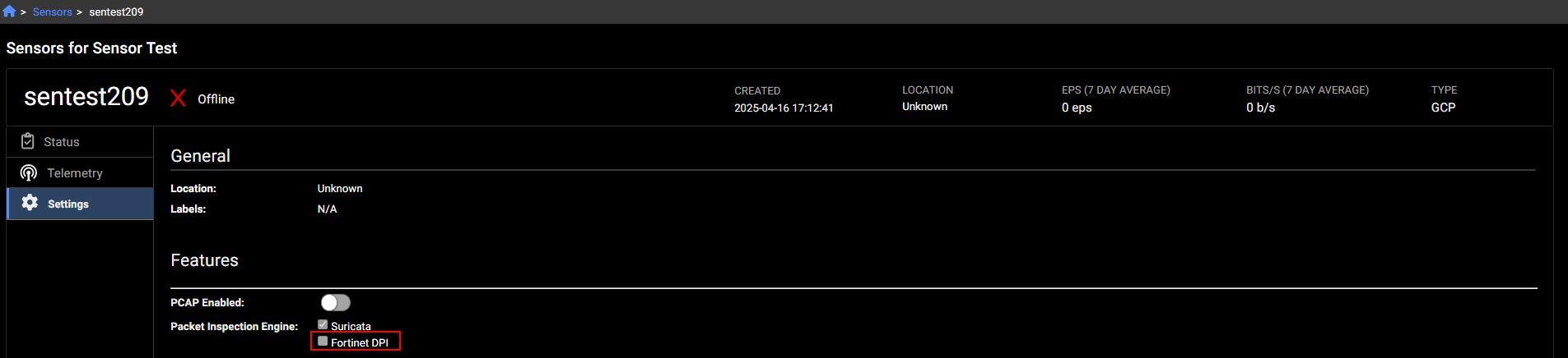 To enable DPI events, go to the sensor's Settings and select Fortinet DPI.