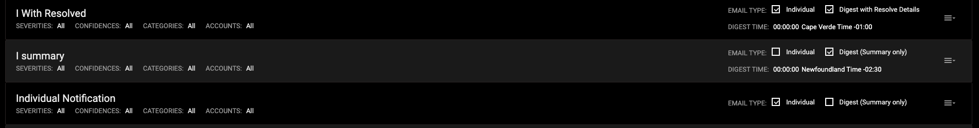 The Email Notifications page will display Digest with Resolve Details next to the email when this feature is enabled. This feature is in limited availability. If you would like it enabled please contact your TSM.