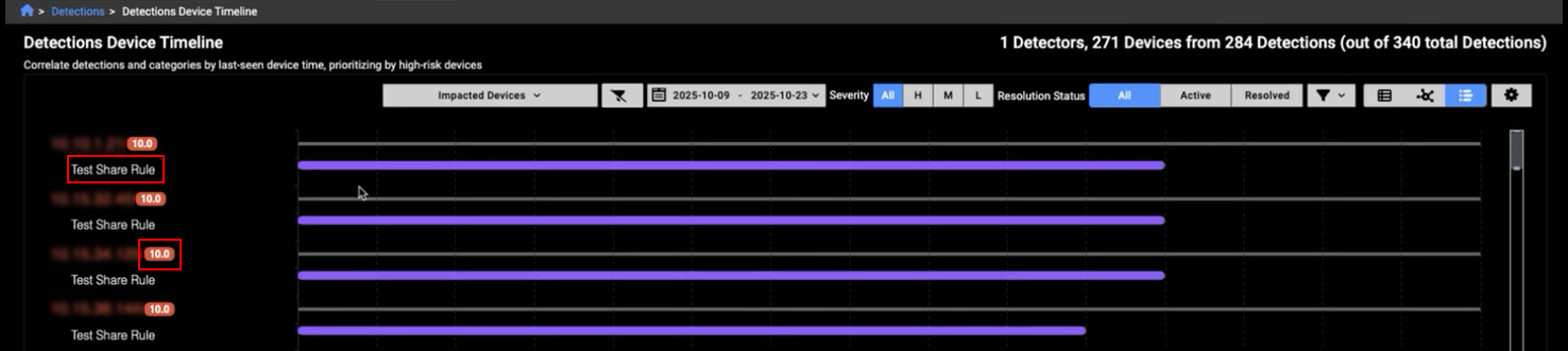You can now filter the timeline to show detections from a specific detector by clicking its name. Risk scores are displayed next to the IP addresses, providing quick insight into the risk level of the detection.