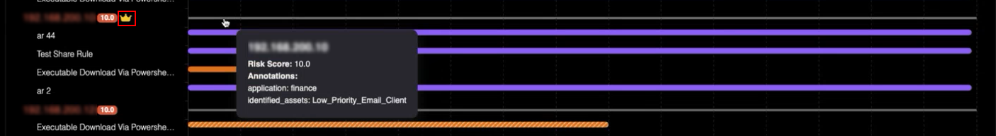 A crown icon appears next to an IP to indicate Identified Assets within the timeline view. The crown's color is determined by the priority level: High, Moderate, or Low.
