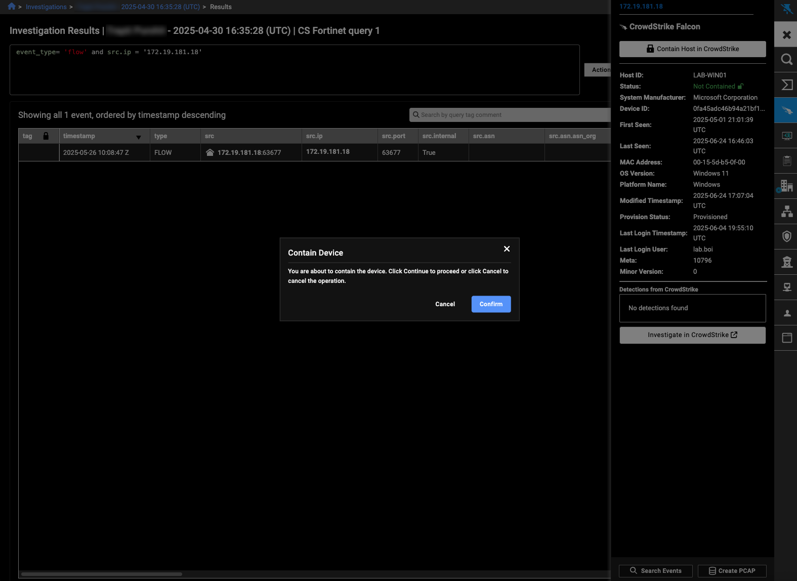The entity panel shows the current status of the device, and includes a button to contain, isolate, or ban the endpoint.