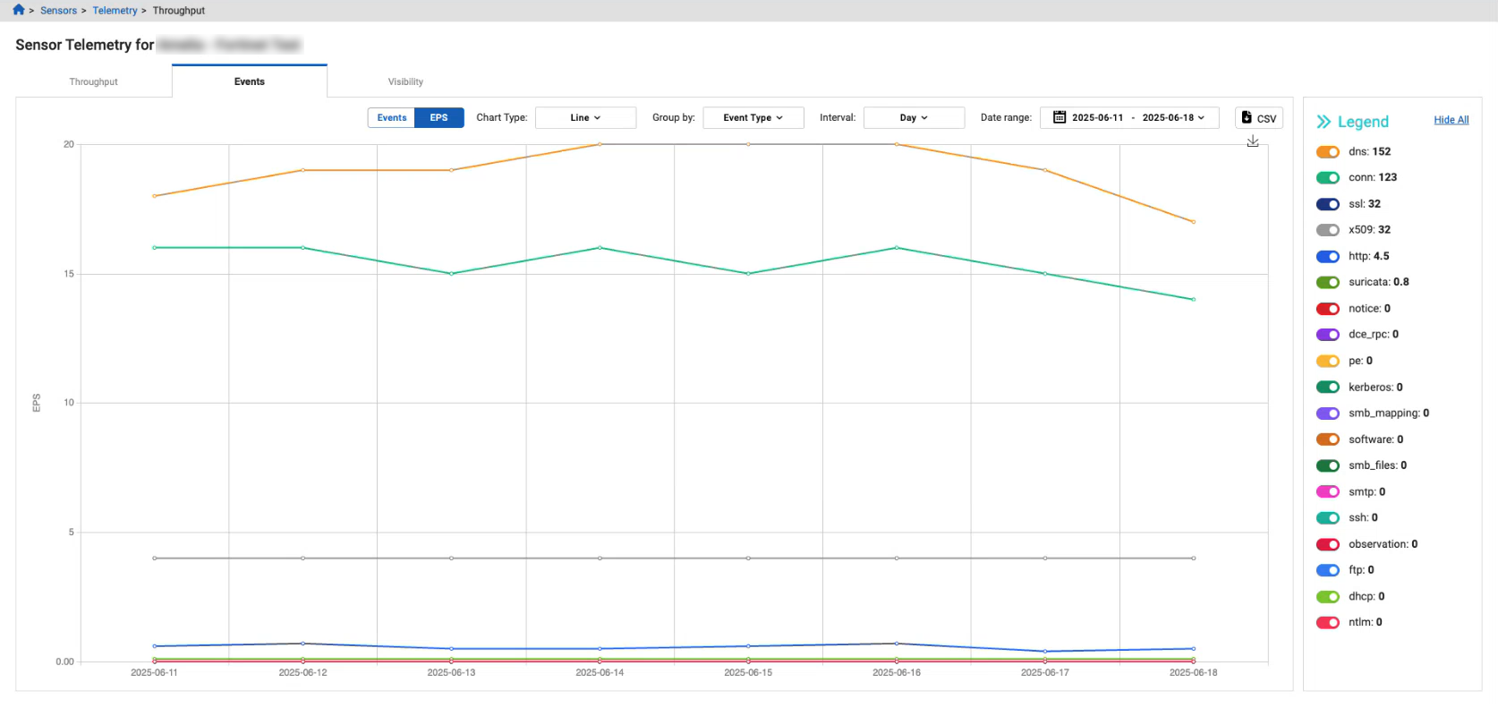 The legend has multiple colors to make it easy to differentiate between the event types, and the event types stay in the same order when switching between Events and EPS views.