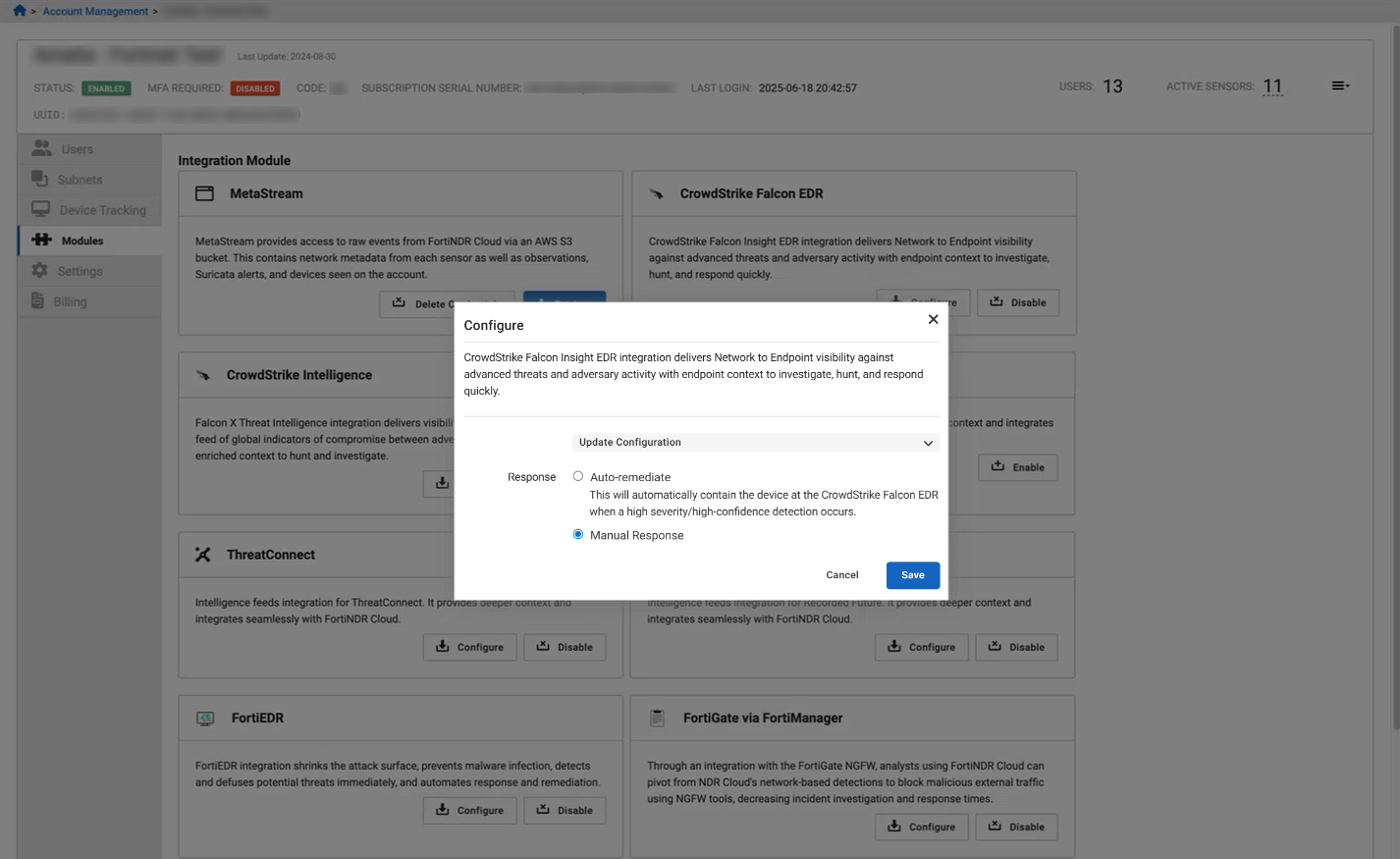Automated integration response modules are added for FortiEDR and CrowdStrike Falcon EDR. Only a single integration can be set to Auto-Remediate at a time; others may be configured, but must be set up to respond manually.