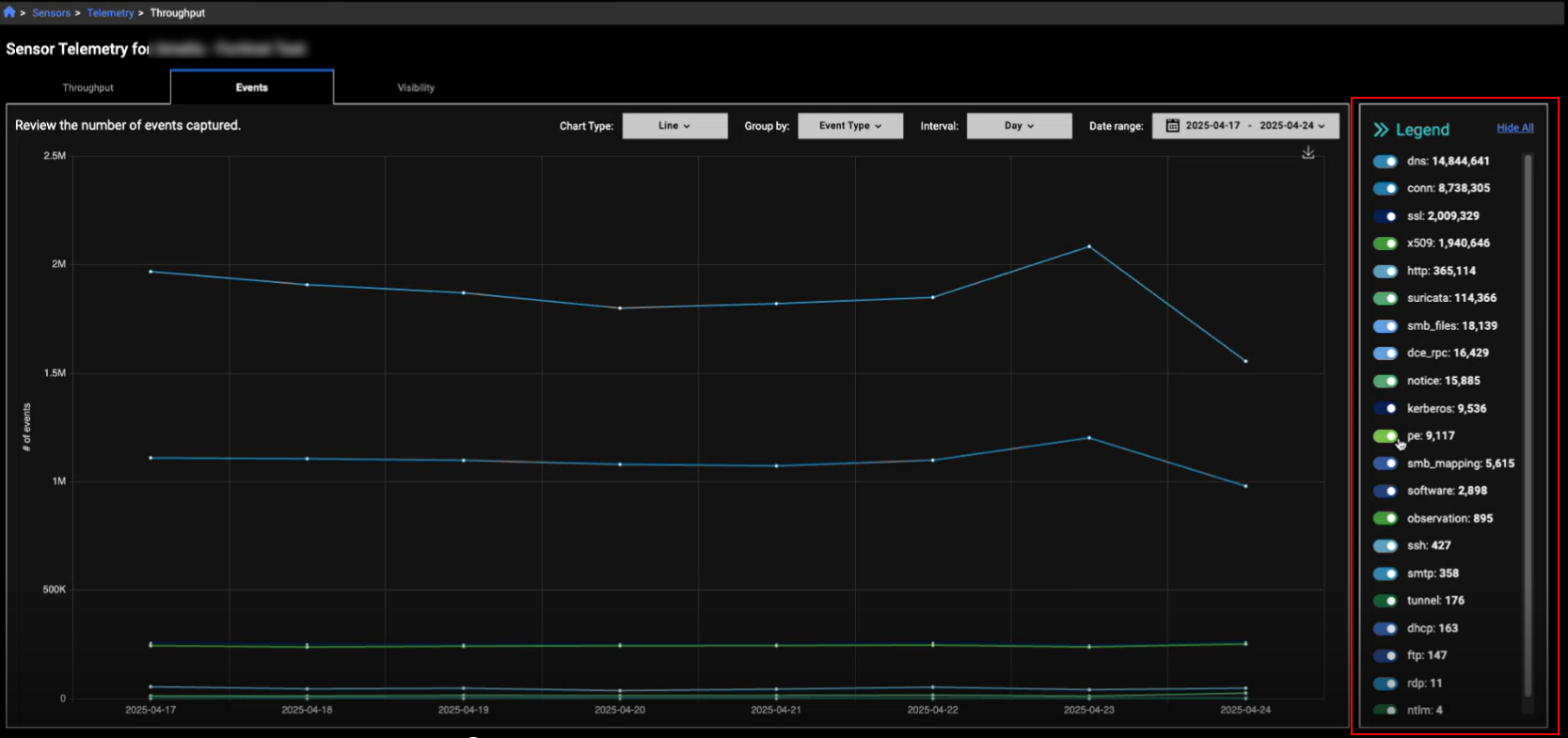 We have added a legend to the Sensor Telemetry page. This is useful when you want to isolate entries on the page. The legend displays the entries in descending order from highest to lowest. You can use the toggles in the legend to show or hide a line in the graph. You also have the option of showing or hiding all entries.