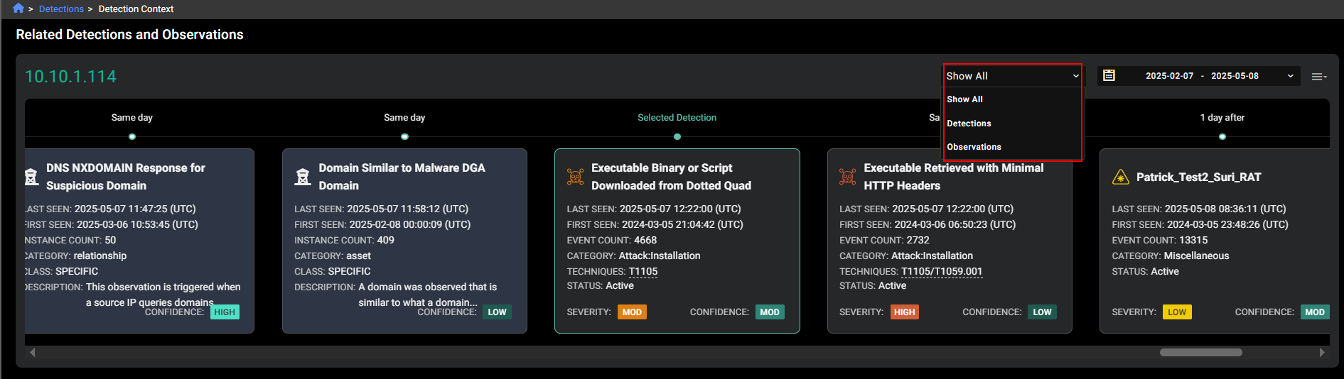 You can filter the Detection Context page by Detections and Observations.