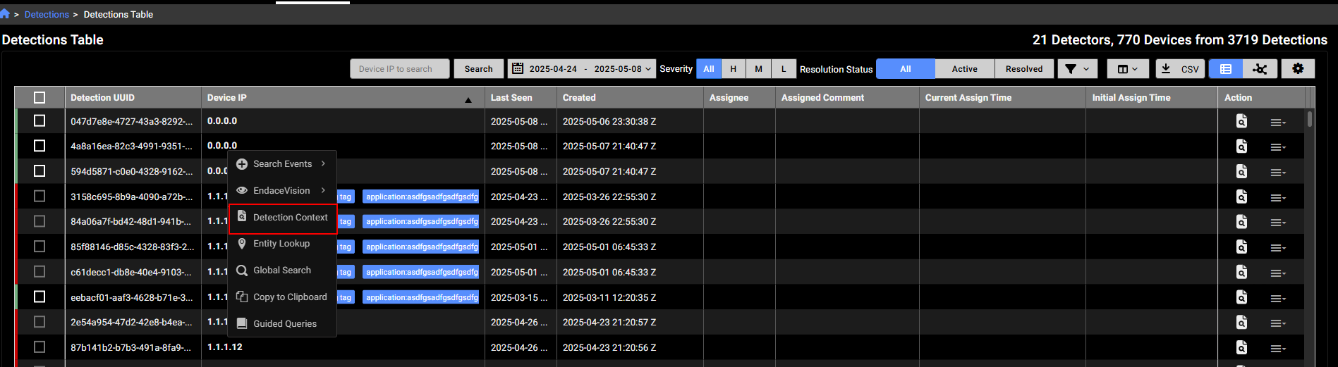 - Right-click an IP that was last seen is within the last year and select Detections Context.