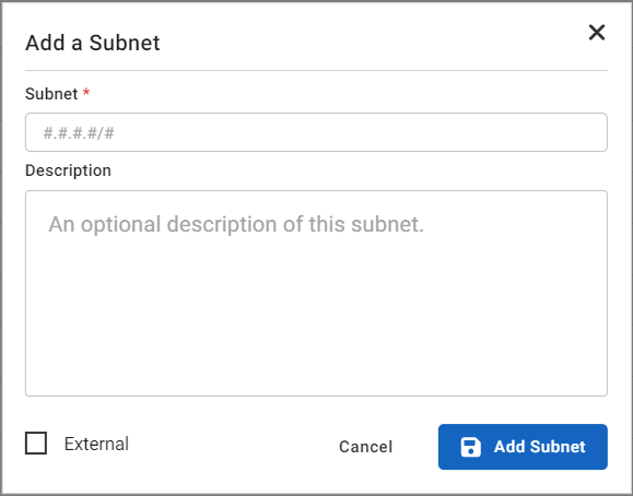Subnet Enter the IP address for the subnet. Description (Optional) Enter a description of the subnet. Exteral Select if this is an internal subnet that will be treated as external by Suricata.