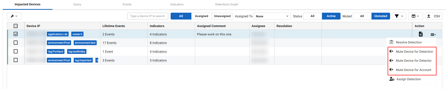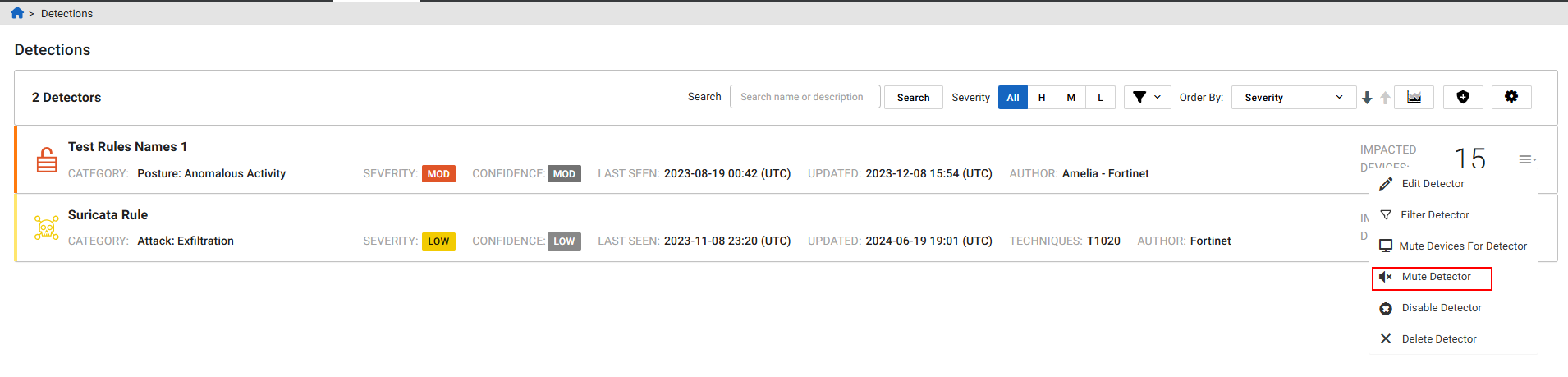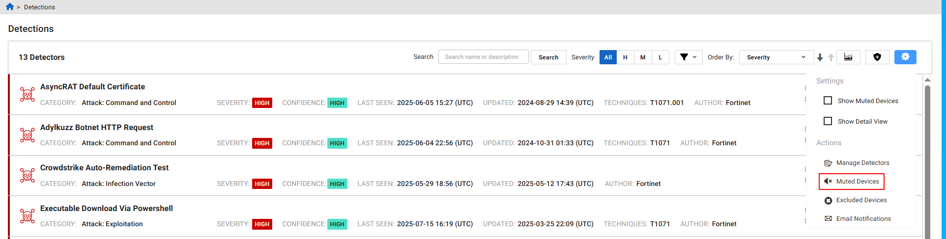 Alliteratively, you can go to Detections > Detections Table. In the Action column, click the menu and select Mute device for detector. |
