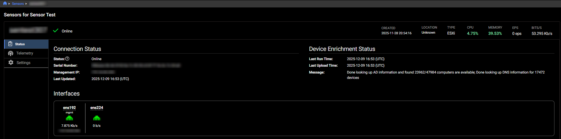 To view the Device Enrichment Status, go the Sensor's details page. See Sensor details.