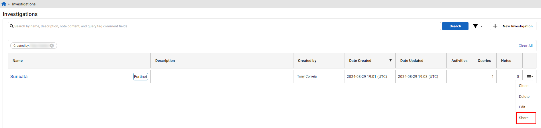To share an investigation with the action menu: