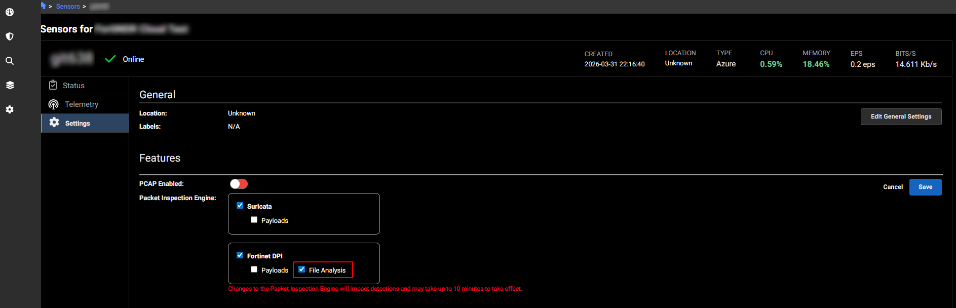- The Packet Capture sensor selector now defaults to no selection and requires users to choose one or more sensors, including All Sensors, before creating an investigation. The Create button remains disabled until a sensor is selected, helping prevent accidental captures.