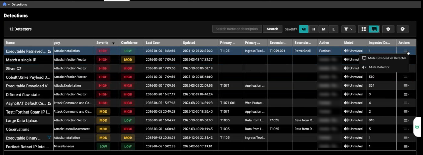 Table View presents detections in a compact, row‑and‑column format for easier sorting and comparison. Each detection appears as a single row with detailed fields such as name, category, severity, confidence, timestamps, author, mute status, and impacted devices. This view is useful when you need to quickly scan large amounts of data, sort by specific columns, or perform detailed analysis across multiple detections.