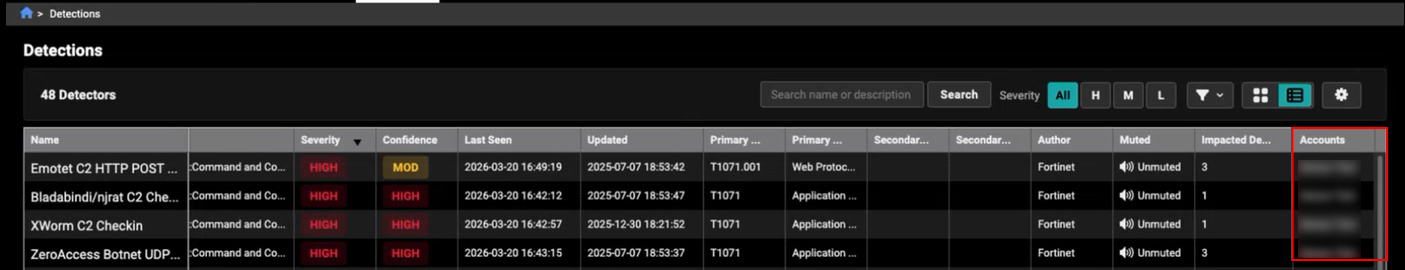 The new Accounts column displays all the accounts a detector is running on whenever you are viewing detectors in the All Accounts view. For detectors that run on a single account, the column shows that account name. When a detector runs across multiple accounts, hovering over the value opens a tooltip listing all associated accounts. This provides quick visibility into detector coverage without leaving the table. A new Exclude Accounts filter has also been added.