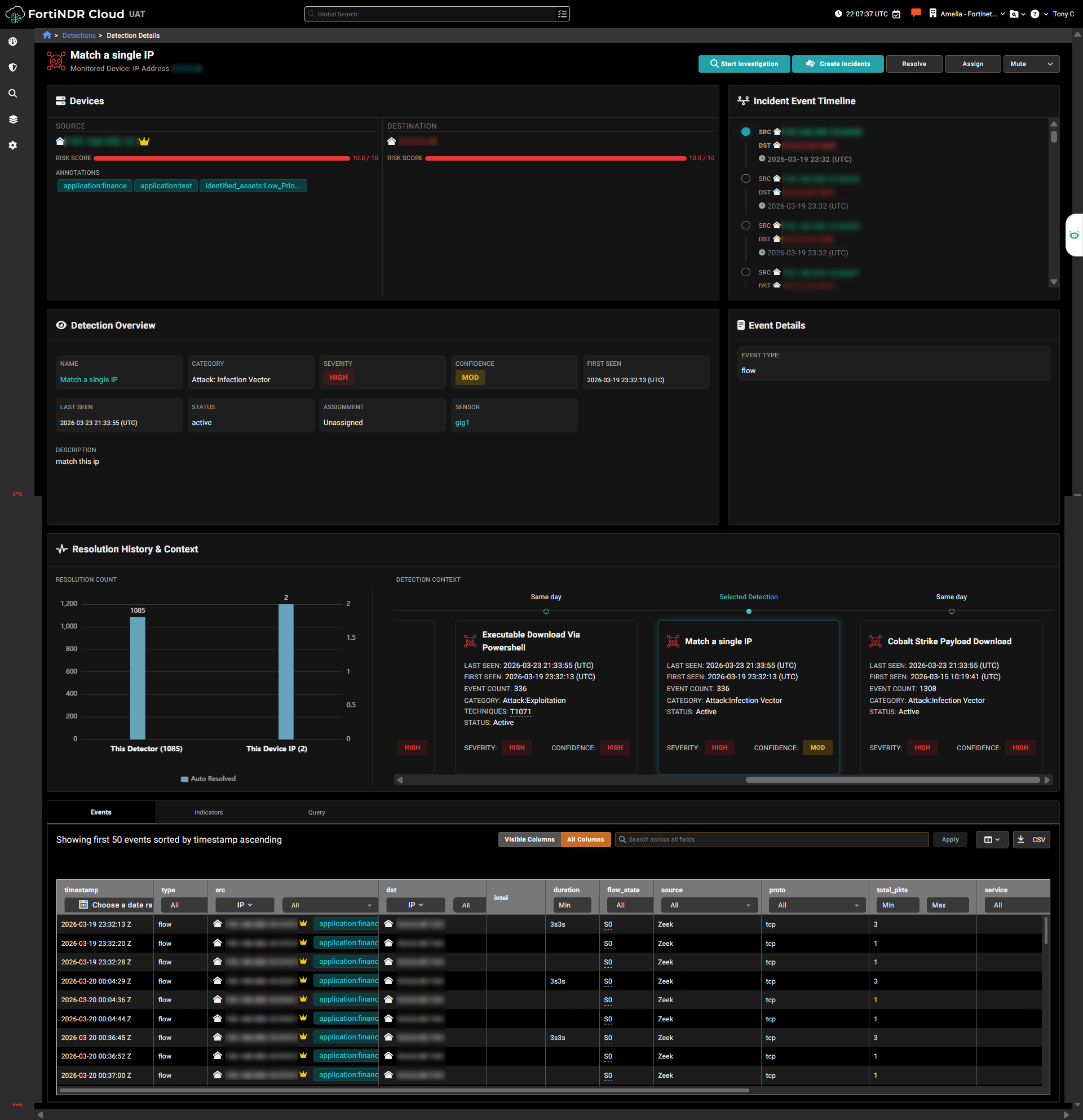 The new Detection Details page now provides a consolidated, in‑depth overview of an individual detection. To access the page from the Detections table, click a row or select the See Detection Details icon. This updated view brings together all essential information, including source and destination IPs, event timelines, resolution history, detection context, and related events.