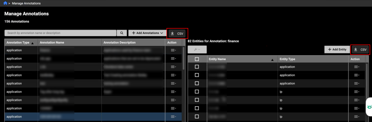 A new CSV download option has been added to the Manage Annotations page, providing download buttons for both the Annotations and Entities table. The downloaded file uses the same structure required for uploads, allowing users to make changes directly in the CSV and then re‑upload it without needing to adjust the format. This enhancement streamlines the edit‑and‑upload workflow and ensures the exported data is immediately ready for reuse.