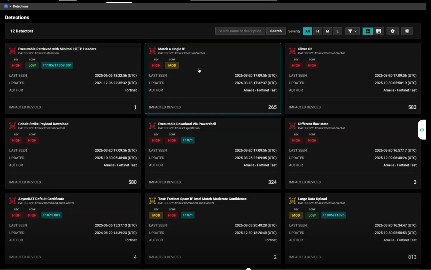 Gallery View is the default layout for displaying detections. It presents each detection as a card in a grid, showing key information such as the detection name, severity, category, last‑seen time, and impacted devices. This view makes it easy to scan multiple detections quickly and identify the most important items at a glance.