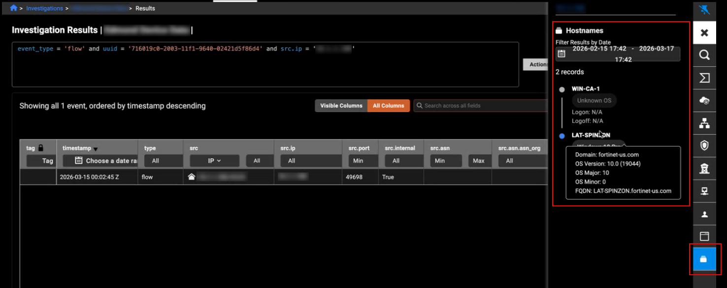 A new Hostnames tab has been added to the Entity Panel to display device enrichment data. This tab shows enrichment fields received from event records, including details such as OS name, OS major and minor versions, and any available login or logout timestamps. Where applicable, the data is presented in chronological order, providing clearer visibility into host-level enrichment information directly within the entity view.