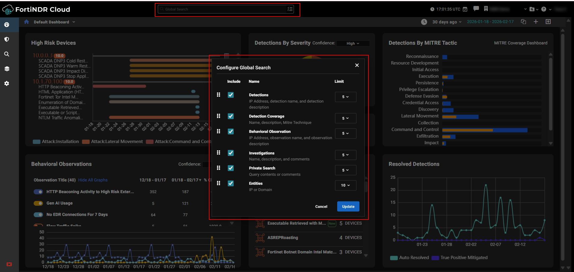 Use the Global Search function to search FortiNDR Cloud with a text string, IP address or domain. Search results are organized by Detections, Detections Coverage, Investigations, Search Timeline and Entity Lookup. You can enter multiple IPs or domains separated by a comma or a space. However, if you are performing a bulk search for IPs FortiNDR Cloud will stop the search after it finds the first IP in the list. |