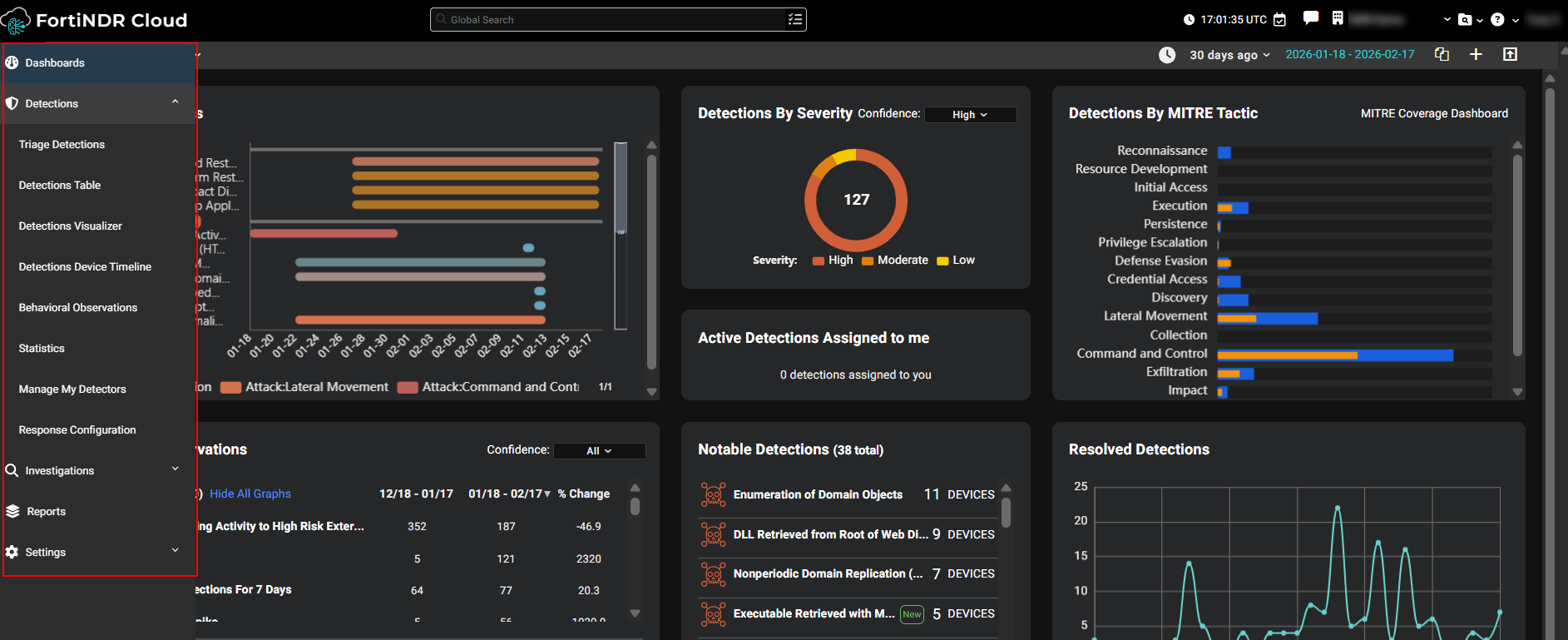 This is the landing page for the FortiNDR Cloud portal and provides high-level summary information. |