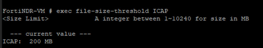 execute file-size-threshold {ICAP|OFTP|inline-blocking|manual-upload|network-share|sniffer} <size_limit_1-10240MB>