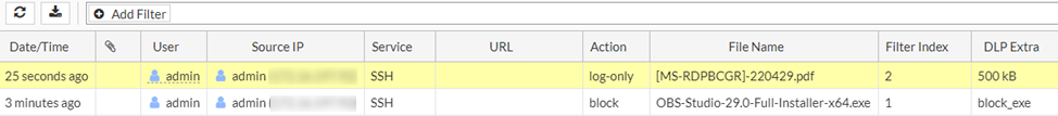 When the user downloads/uploads a file larger than 500KB via the WinSCP launcher, FortiPAM generates a log entry in Log & Report > Data Leak Prevention.