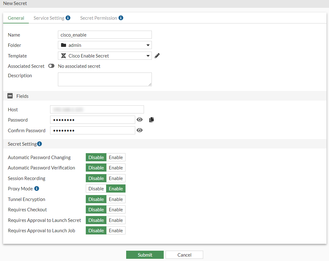 - In the Template dropdown, select Cisco Enable Secret default template.