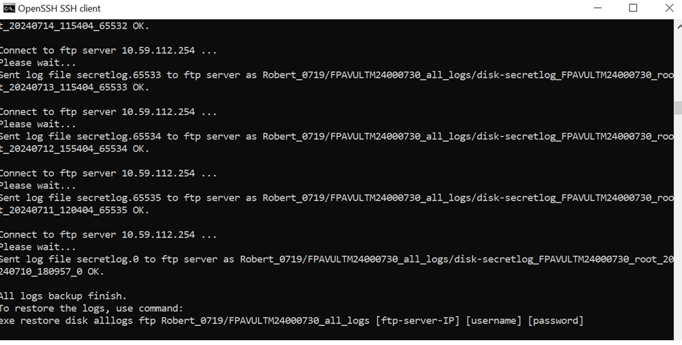 After the logs backup is completed, All logs backup finish is displayed on the console.