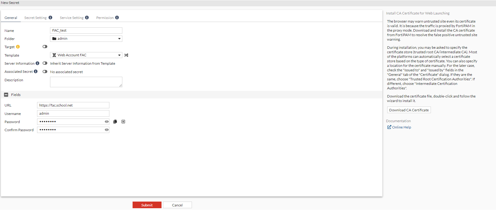 We create a secret based on the secret template in Creating a secret template to connect to FortiAuthenticator.