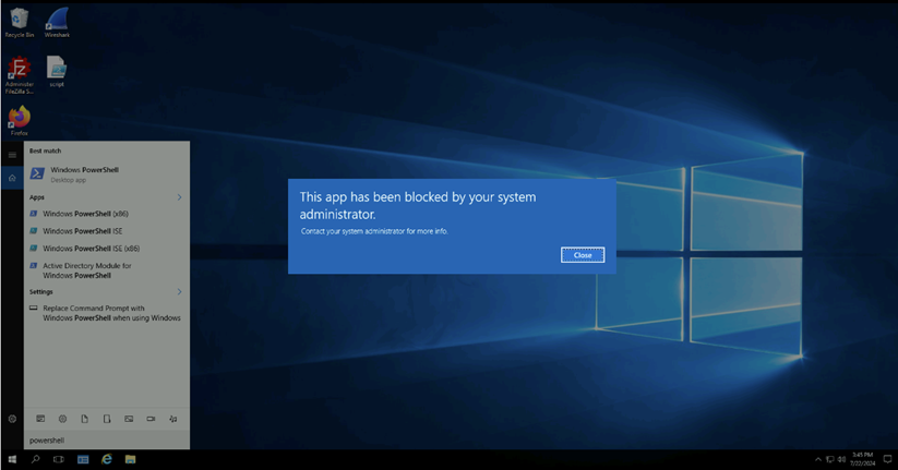 - Verify the Windows application filter functionality by executing the blocked executables and scripts: