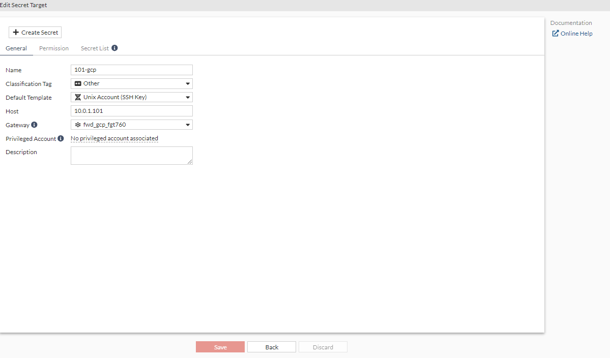 10.0.1.101. - In the Gateway dropdown, select the gateway created in Configuring a gateway on the FortiPAM server.