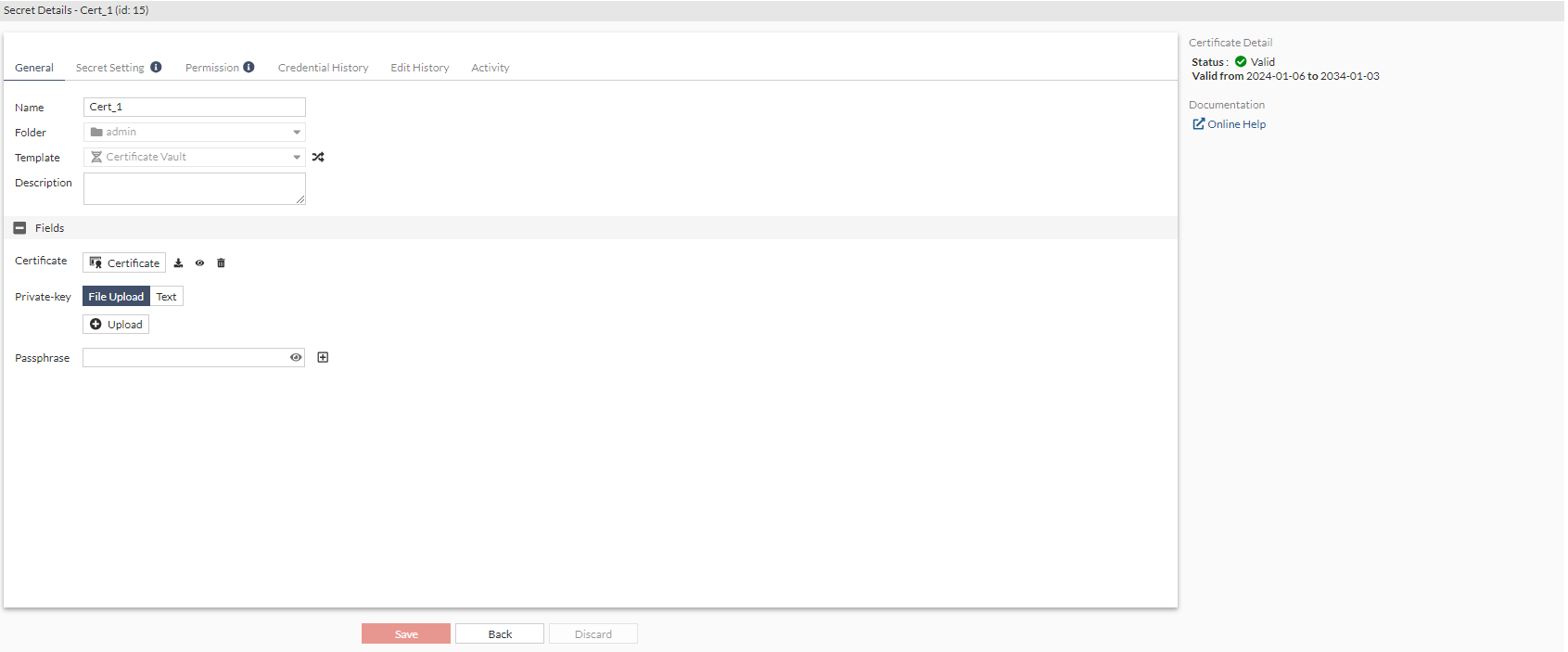 When the certificate secret is opened, the certificate status is displayed on the top-right under Certificate Detail.