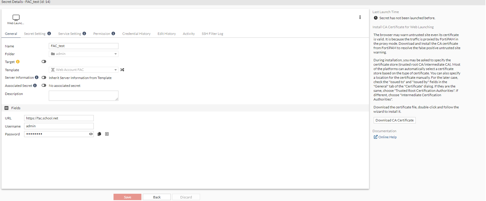 We launch the secret created in Creating a secret to connect to FortiAuthenticator.