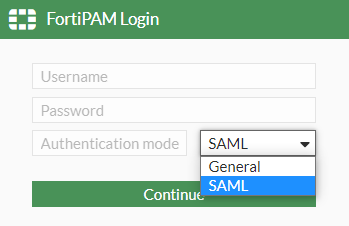 - On the login screen, select SAML from the dropdown, and click Continue.
