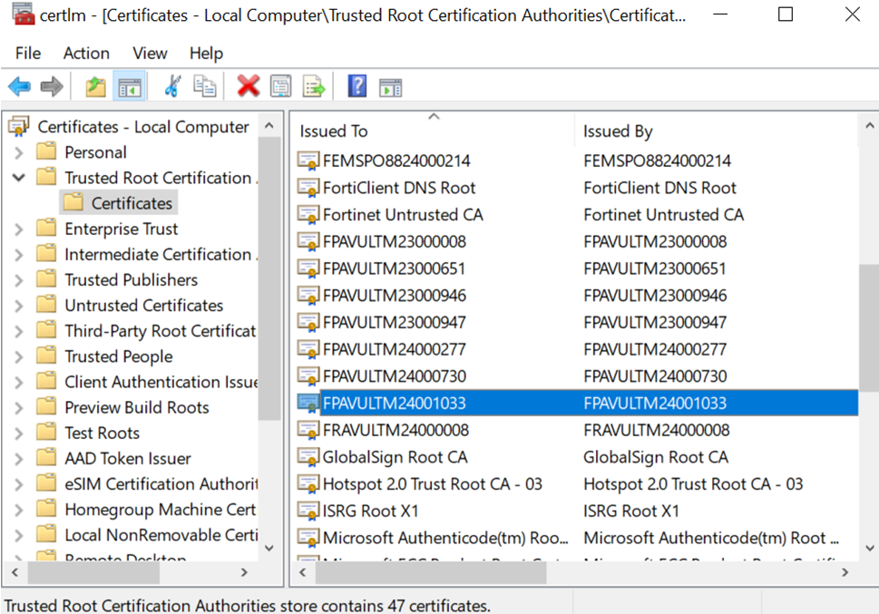 - Wait for a few minutes. All the Windows host with FortiClient belonging to Endpoint Profiles in step 2 are pushed and installed above the default FortiPAM CA certificate.