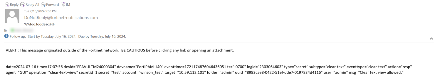The alert email contains information about secret password being viewed by the user.