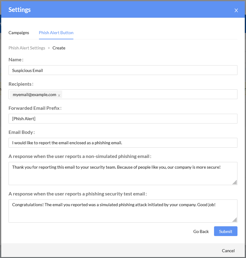 Setting Description Name The alert button name. Recipients Enter the email address of the admins to be notified when an email is reported. Forwarded Email Prefix The prefix that appears before the subject of the suspicious email. Email Body The email message body recipients send to report a suspicious email. A response when the user reports a non-simulated phishing email The email message body recipients see when they report a non-simulated email. A response when the user reports a phishing security test email The email message body recipients see when they report a simulated email.