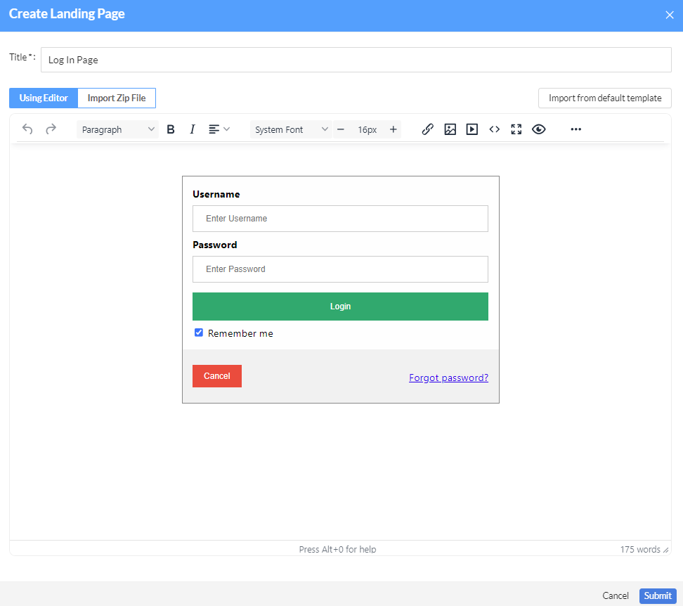 You can create a custom landing page with the text editor or by uploading a Zip file. Custom landing pages support variables to create more convincing campaigns.
