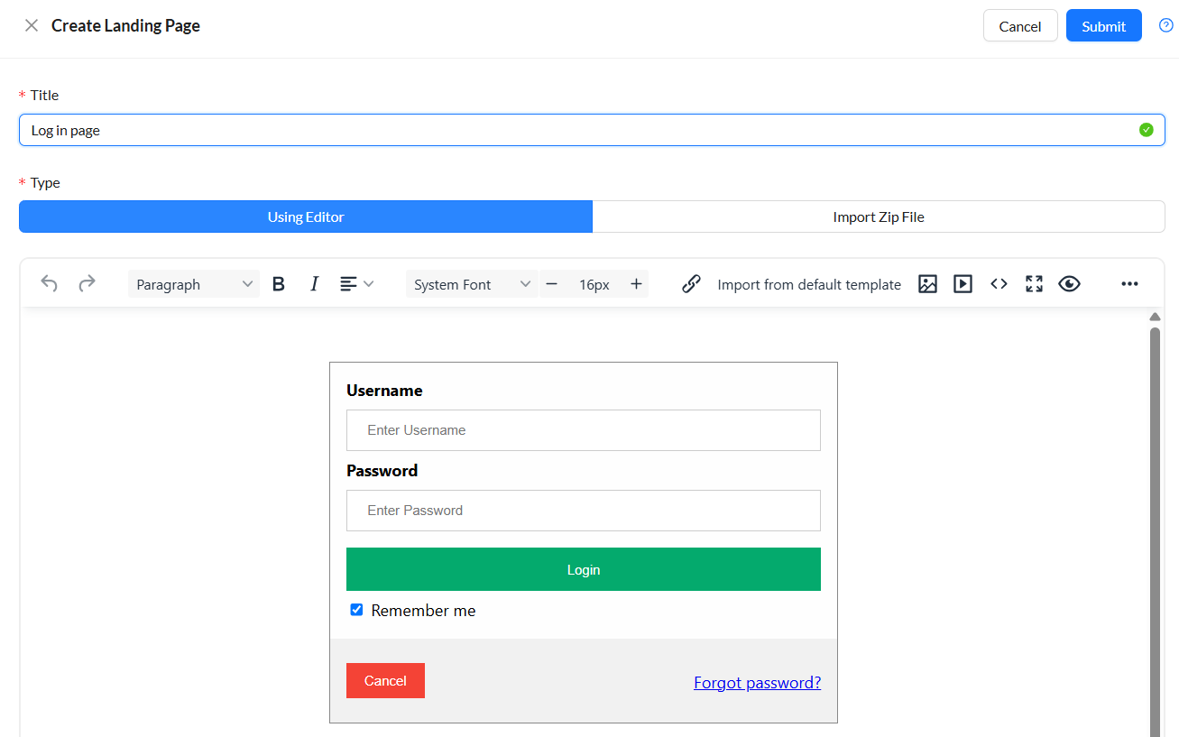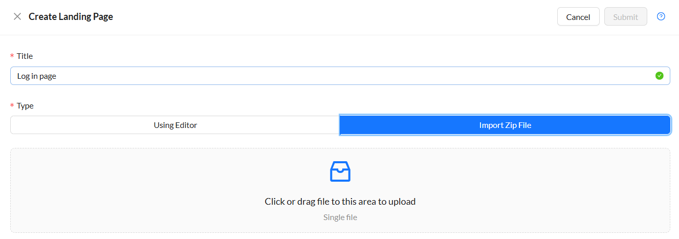 - Click Submit. The landing page is imported and added to the Landing Page list.