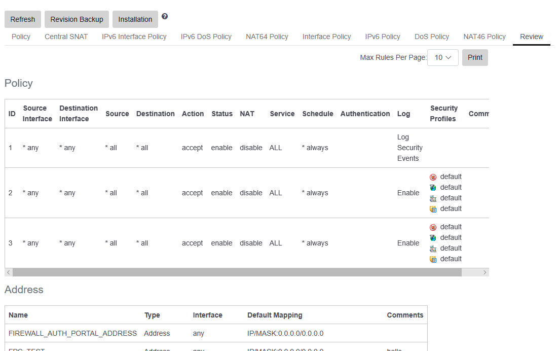 Go to Policy & Objects > Policy > Review to see all policies and firewall objects that have been configured.