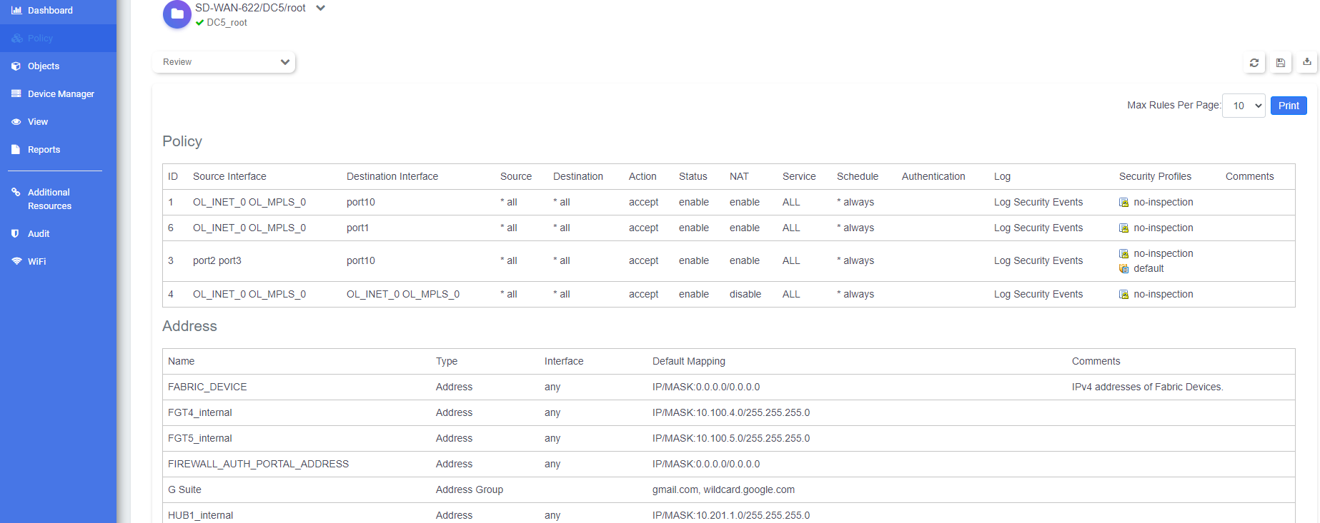 Click Policy, from the dropdown list, select Review to see all policies and firewall objects that have been configured.