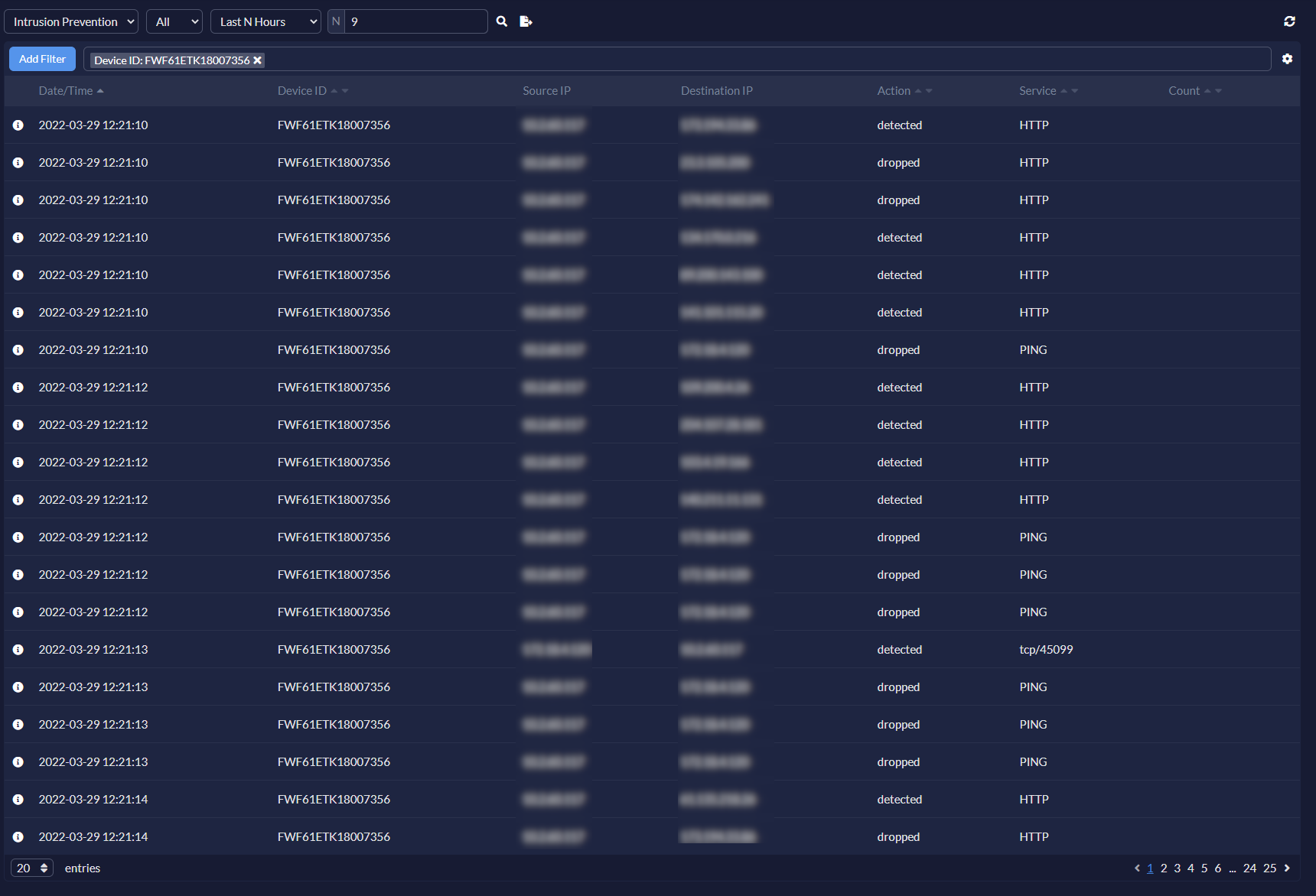 The Intrusion Prevention tab in Insights > Logs displays event logs grouped by attack.