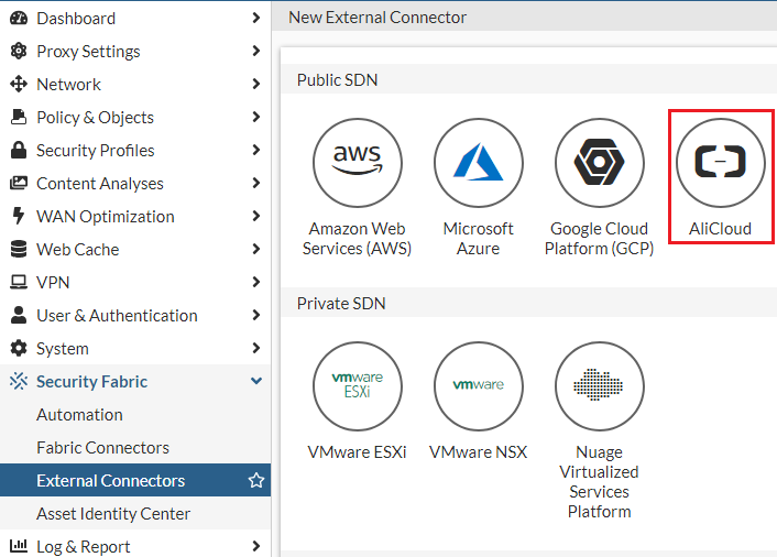 Under Security Fabric > External Connectors, you can now create an AliCloud connector to connect your FortiProxy unit to Alibaba Cloud.